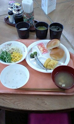 今は朝食を食べています。主なメニューは、パン、お粥、シシャモ、出し巻き玉子、納豆、ごぼうと大根のサラダなどです。