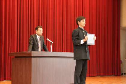 代表して、生徒会長の森島君に受け取ってもらいました。
