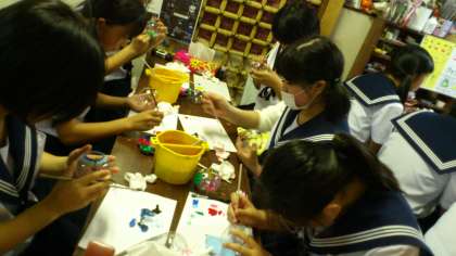 ガラスの内側から、顔料と筆を使って思い思いに絵や模様を付けています。