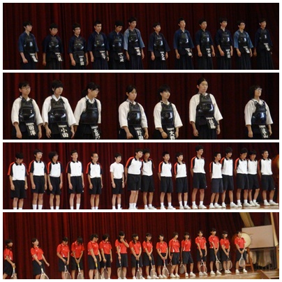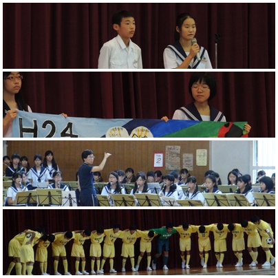 ステージ上に並んだ選手たち そして演奏する吹奏楽部の皆さん