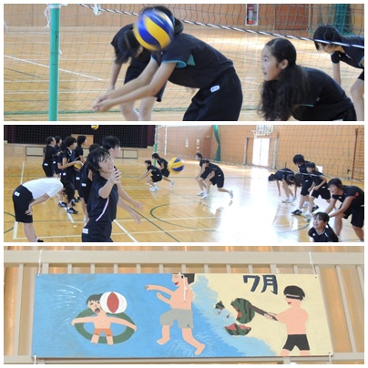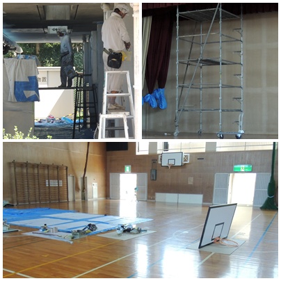 夏休み中 西部中学校の体育館は屋根、スクリーン設置、フロアのライン引き直しなど