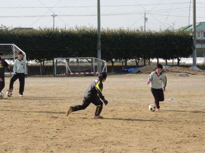2/9(土) サッカー部の練習 パスを出すとき ディフェンスとの間合いを確認していました。