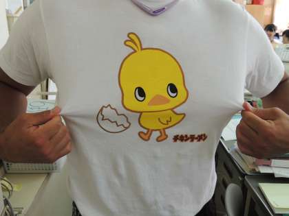 今朝着てきたTシャツの柄はひよこ(その下にチ★★ラーメン)