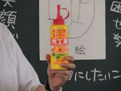先生が、「物をつくるときの線は、面と面の境目にできる。では、この木工用ボンドの境目は、何と何の間が境目になるのでしょう?」という質問をしていました。