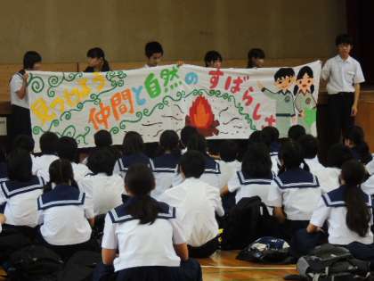 明日からの自然教室に向けて2年生は学年集会を行いました。