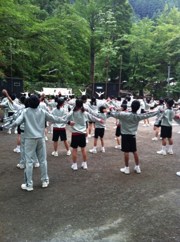 ラジオ体操をやり、お話を聞いています。
