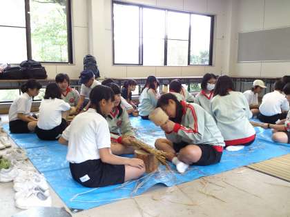 風土教室、午後はわら細工に取り組んでいます。 友達と協力しながら、楽しく頑張っています!