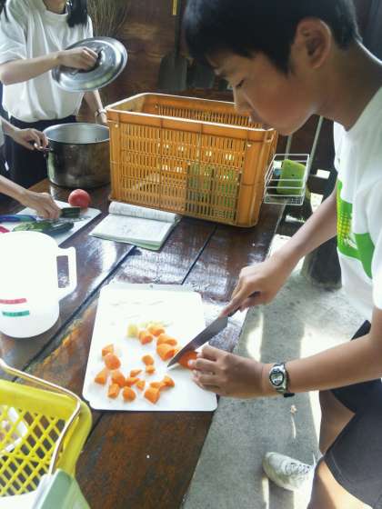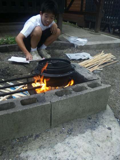 今日の夕飯はキャンプと言えば「カレー」です。なれた手つきで、野菜を切り、米を炊きます。昨日とは手つきが違います。