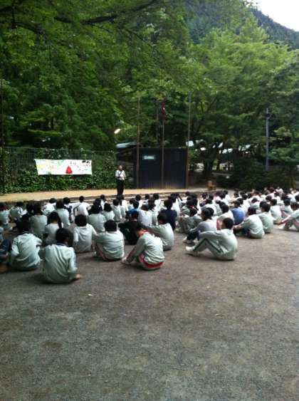 阿部先生の話を聞いて、ムードを作り、広場に入場します。