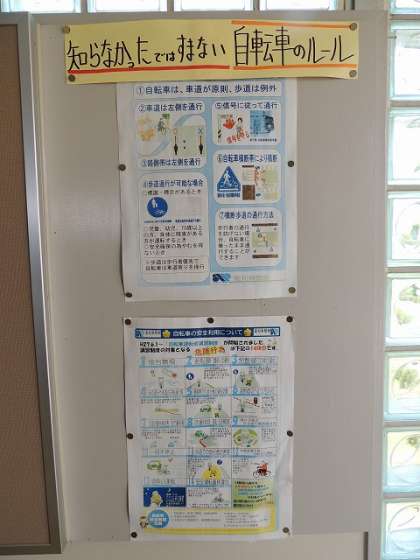 下駄箱のところの掲示物です。通学以外にも利用する機会が多いと思います。意外と知らない規則があります。安全に利用するためにも是非この掲示物を見てほしいと思います。