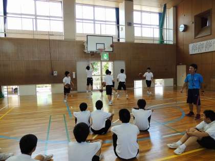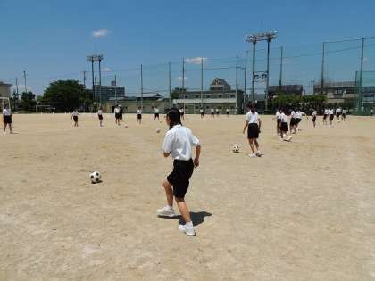 男子は体育館でバスケットボールのリバウンドの練習、女子は運動場でサッカーのインステップキックの練習に取り組んでいます。みんながんばっています。