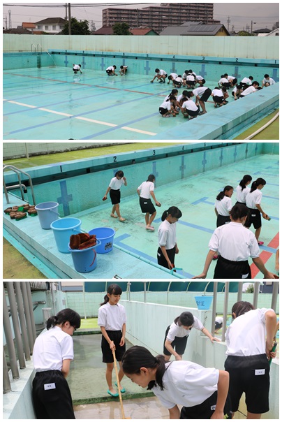 保健体育の水泳指導に向けてプール掃除を行っています。プール掃除を終えプールに水が入ると、いよいよ夏も本番という感じです。