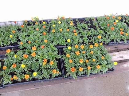 体育館前で、マリーゴールドとサルビアの花がきれいに咲いています。本日のような雨上がりの朝などに、このような花を目にすると心がなごみます。