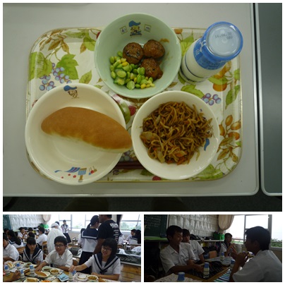 今日の献立は、ミニロールパン、牛乳、焼きそば、豆腐だんご、枝豆サラダでした。