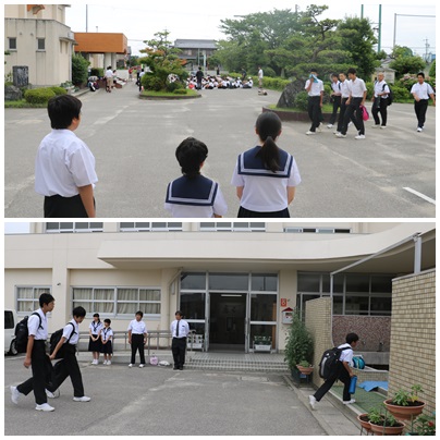 2年生がいないので少し寂しいあいさつ運動です。 体育館前では、2年生が出発式を行っていました。