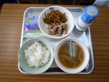 今日の給食は、ご飯、牛乳、和風ポークソテー、五目きんぴら、ぬっぺ汁、ブルーベリーゼリーでした。