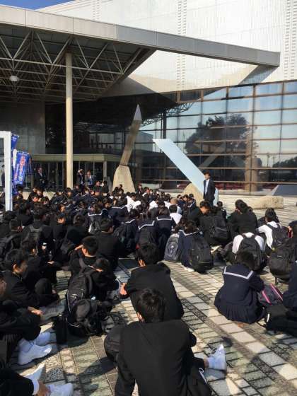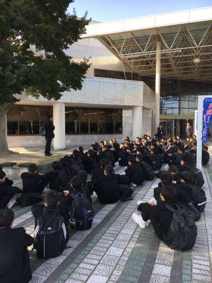 お昼ご飯を終え、会場の準備を待ちながら連絡を受けます。 午後は落語です!