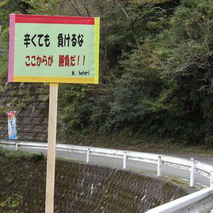 岐阜県の揖斐川町で日曜日に「2016いびがわマラソン」が開催されます。高低差が100メートル以上ある厳しいコースです。この看板はここ数年フルマラソンの34キロ周辺に立てられています。42キロを走破するフルマラソンでは30キロを過ぎてからが勝負の分かれ目となります。3年生の皆さんは今がその時です。自分の目標に向けて自分に負けることなくがんばってほしいと思います。