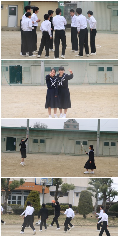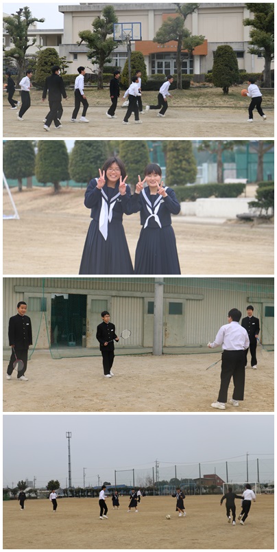昼休みの運動場。曇り空です。 風もなく穏やかで、多くの生徒が元気に過ごしていました。