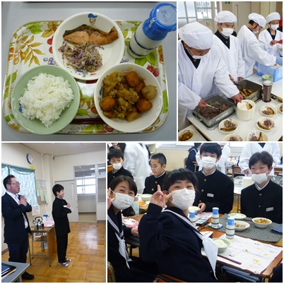今日の給食は、ご飯、牛乳、さけの塩焼き、じゃがいものうま煮、ゆかり和えでした。