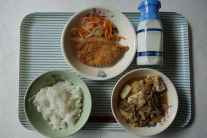 虹鱒のフライ、かしわのじゅんじゅん、日野菜のあえもの、ごはん、牛乳