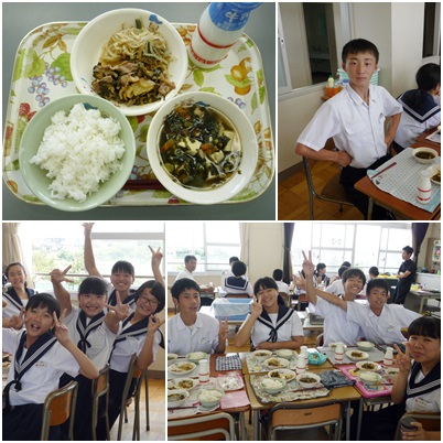 今日の給食は、ご飯、牛乳、豚肉のキムチ炒め、山菜ナムル、わかめスープでした。