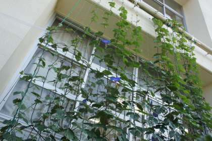 緑のカーテン「リュウキュウアサガオ」が梅雨を迎えて上へ上へと伸びてきました。