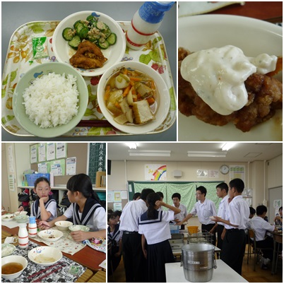今日は宮崎県の郷土料理で、ご飯、牛乳、チキン南蛮、きゅうりのツナ和え、かねんしゅいでした。