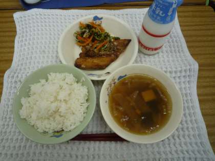 今日は広島県の郷土料理で、ご飯、牛乳、たちうおの竜田揚げ、広島菜の和え物、水軍鍋でした。