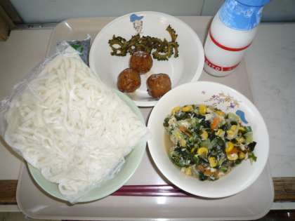 今日の給食は、サラダうどん(冷やしうどん、めんつゆ)、牛乳、肉だんご、ゴーヤチップスでした。