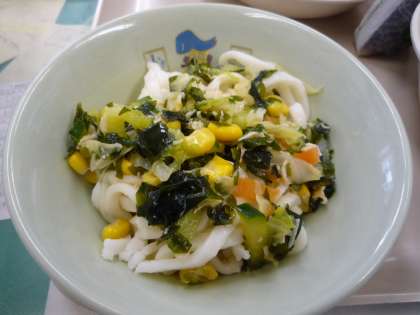 暑い教室で食べるので、冷たいめんはおいしいですね!冷やしうどんに具をのせ、つゆをかけて食べました。