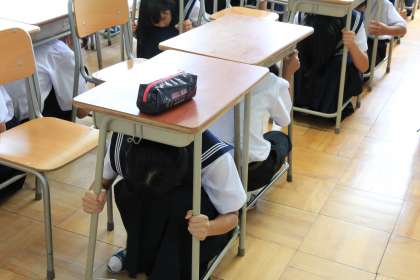 大きな地震にみまわれたときの自己防御姿勢の訓練を行いました。