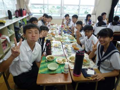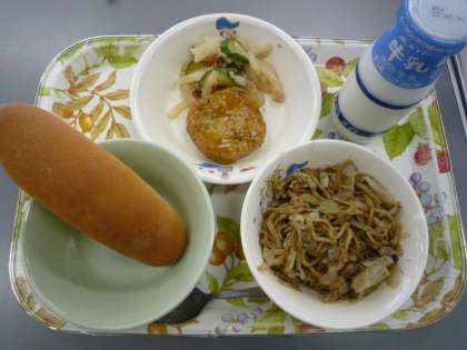 今日の給食は、ミニロールパン、牛乳、焼きそば、野菜入りつくね、大根ツナサラダでした。焼きそばは久しぶりの登場でした。中にはパンに挟んで食べる人も見られました。