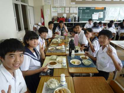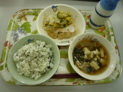 今日の給食は、わかめご飯、牛乳、かわはぎの照り焼き、切り干し大根の和え物、豆腐のすまし汁でした。旬のかわはぎは、やわらかくておいしかったですね。